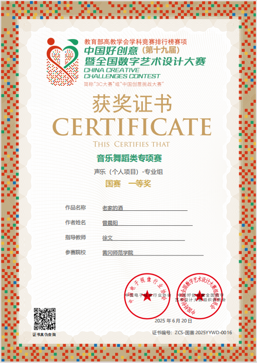 本网讯 近日,中国好创意(第十九届)暨全国数字艺术设计大赛音乐舞蹈专项赛国赛终评结果揭晓,我校音乐学院、黄梅戏学院荣获国赛优秀组织奖,由徐文副教授指导、2022级音乐表演专业学生曾晨阳表演的个人作品《老家的酒》在众多优秀作品中脱颖而出,荣获国赛一等奖。