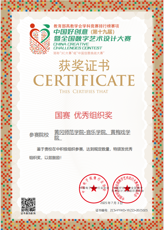近年来,我校始终坚持“师生共育、教学相长”理念,积极开展有组织的各类学科专业竞赛参赛、备赛活动,连续两年荣获中国国际大学生创新大赛国赛铜奖,首获2024全国第七届大学生艺术节乙组(专业组)一等奖等高级别奖项。下一步,我校将持续以数字技术为笔、以文化自信为墨,在传承艺术现代化表达的赛道上书写更多黄师答卷,为中华优秀传统文化的创造性转化与创新性发展注入更多的黄师动能。